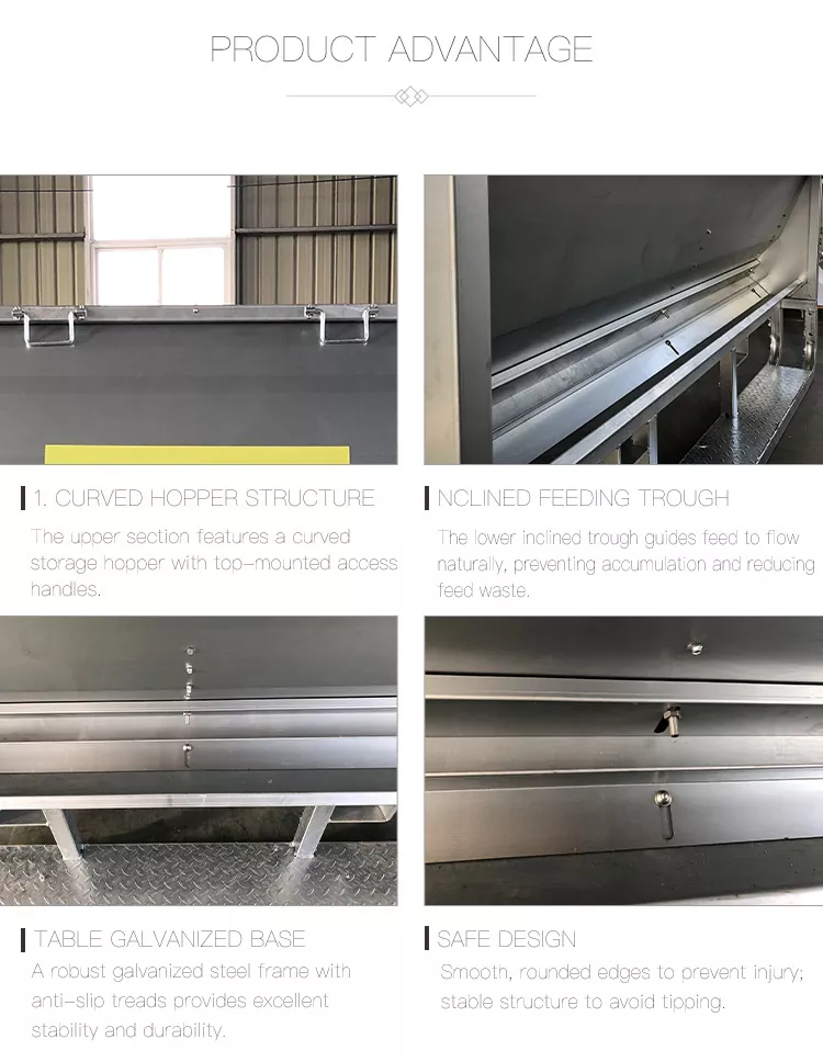 2. Geneigter Futtertrog: Der untere geneigte Trog leitet das Futter in einen natürlichen Fluss, verhindert Ansammlungen und reduziert Futterverschwendung.